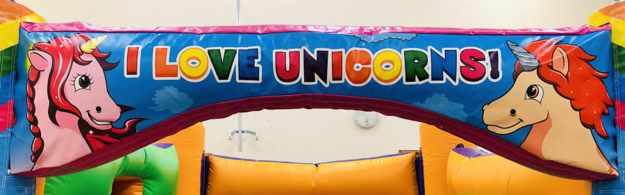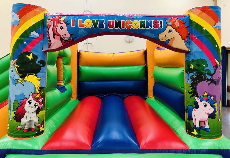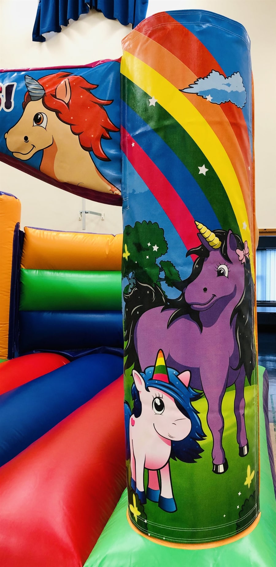 Our Low Height 'Unicorns' Bounce 'N' Slide bouncy castle is a smashing bouncy castle which the kids have lots of fun on and is perfect for most medium to large gardens. This castle is popular for childrens parties and school events across the Mendips, and with it's superb digital printed artwork in a colourful 'Unicorns' theme and bright colours it is suitable for both boys & girls up to 1.3 metres in height. This castle also fits into most of the local village halls with it's lower height of 7ft 9in.