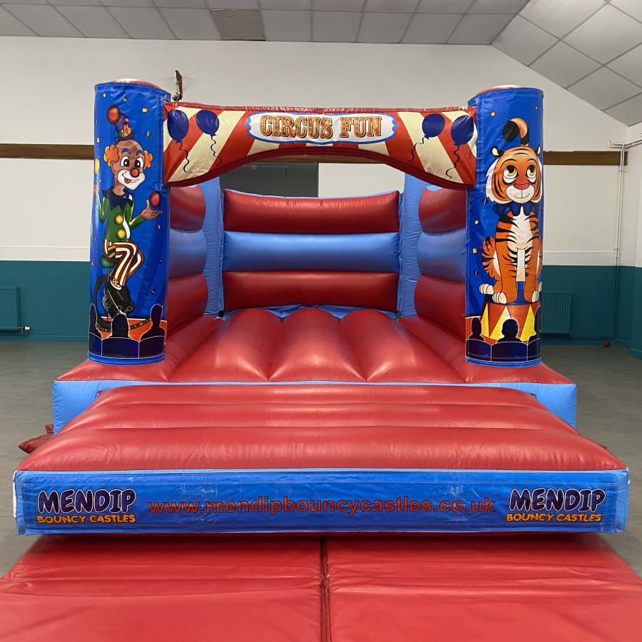 Our Low Height 'Circus' H-frame bouncy castle is a smashing bouncy castle which the kids have lots of fun on and is perfect for most sized gardens. This castle is popular for childrens parties and school events across the Mendips, and with its superb digital printed artwork in a colourful 'Circus' theme and bright colours it is suitable for both boys & girls up to 1.3 metres in height. This castle also fits into most of the local village halls with it's lower height of 7ft 9in.