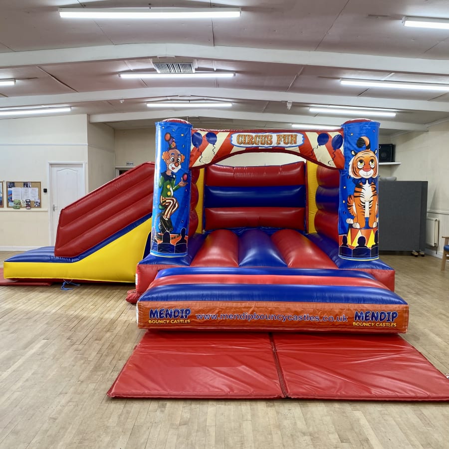 Our Low Height 'Circus' Bounce 'N' Slide bouncy castle is a smashing bouncy castle which the kids have lots of fun on and is perfect for most medium to large gardens. This castle is popular for childrens parties and school events across the Mendips, and with it's superb digital printed artwork in a colourful 'Circus' theme and bright colours it is suitable for both boys & girls up to 1.3 metres in height. This castle also fits into most of the local village halls with it's lower height of 7ft 9in.