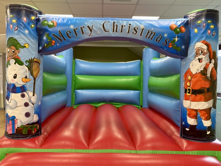 Our Low Height 'Christmas' H-frame bouncy castle is a smashing bouncy castle which the kids have lots of fun on and is perfect for most sized gardens. This castle is popular for childrens parties and school events across the Mendips, and with its superb digital printed artwork in a colourful 'Christmas' theme and bright colours it is suitable for both boys & girls up to 1.3 metres in height. This castle also fits into most of the local village halls with it's lower height of 7ft 9in.