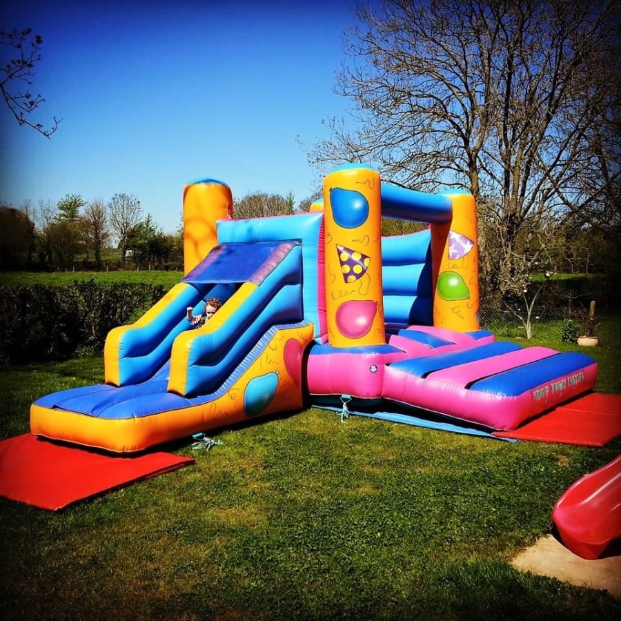 When measuring the area for the site of the inflatable please also allow extra space for the following. You will need to allow a minimum of 4 feet at the front of the castle for safety mats and 5 feet at the rear for the blower & inflation tube, this castle also requires a minimum of 4 feet on the side of the castle where the slide comes down again to allow for a safety mat. On the other side of the bouncy castle allow 2 feet for access.