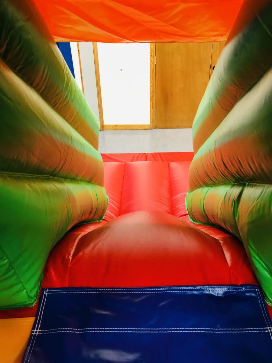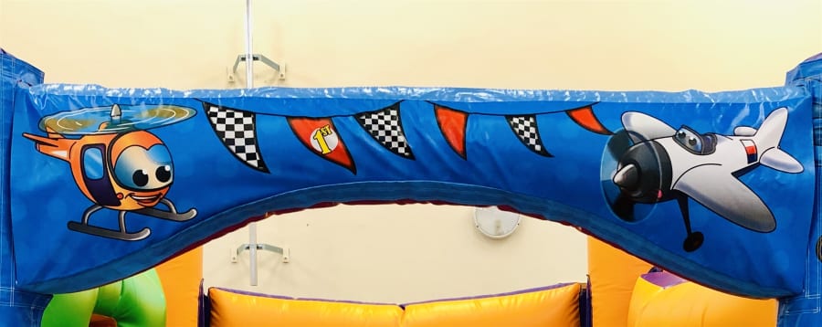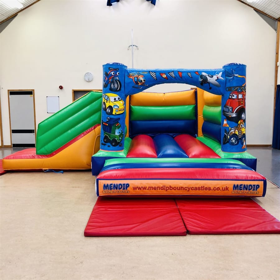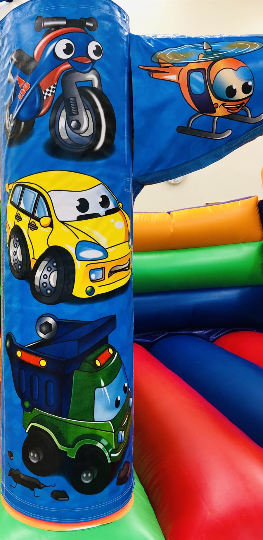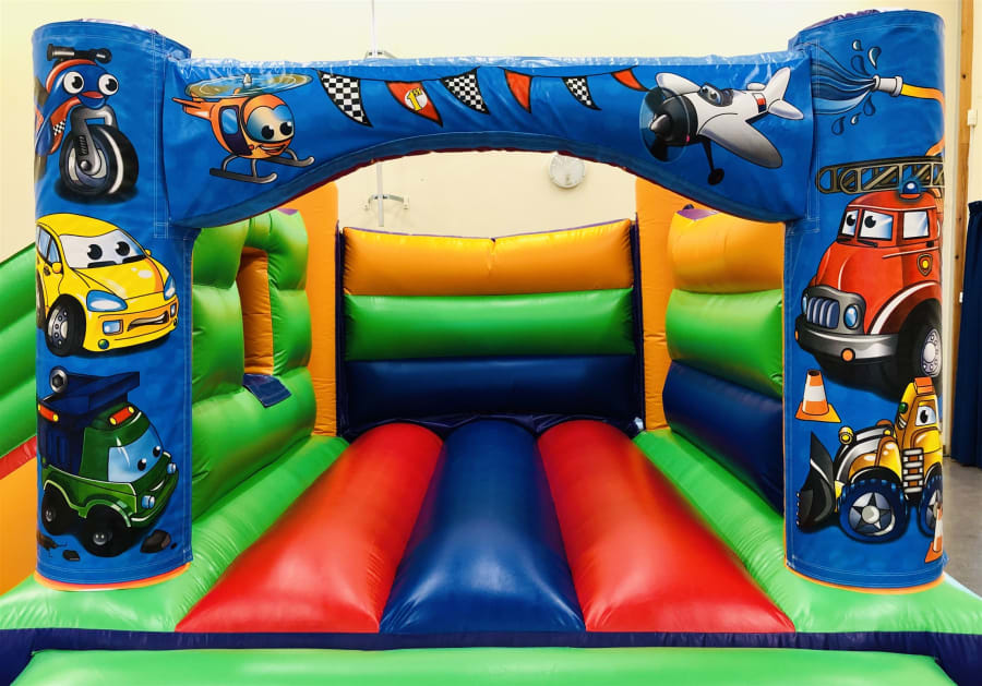 Our Low Height 'Transport' Bounce 'N' Slide bouncy castle is a smashing bouncy castle which the kids have lots of fun on and is perfect for most medium to large gardens. This castle is popular for childrens parties and school events across the Mendips, and with it's superb digital printed artwork in a colourful 'Transport' theme and bright colours it is suitable for both boys & girls up to 1.3 metres in height. This castle also fits into most of the local village halls with it's lower height of 7ft 9in.