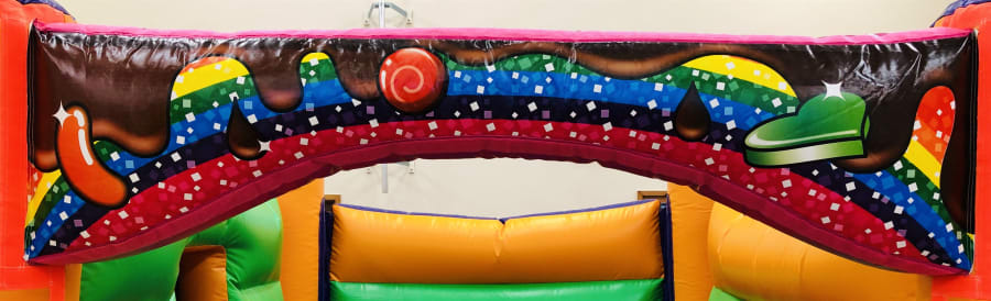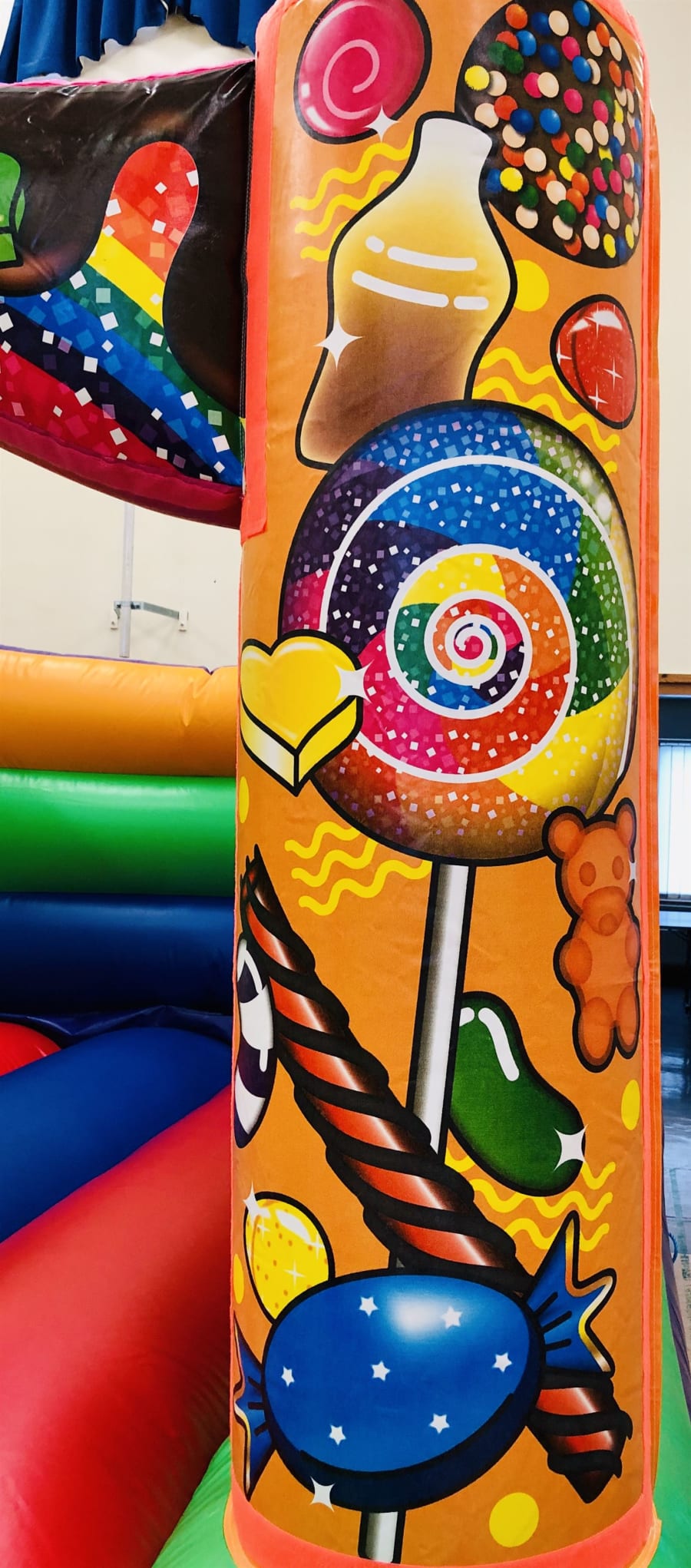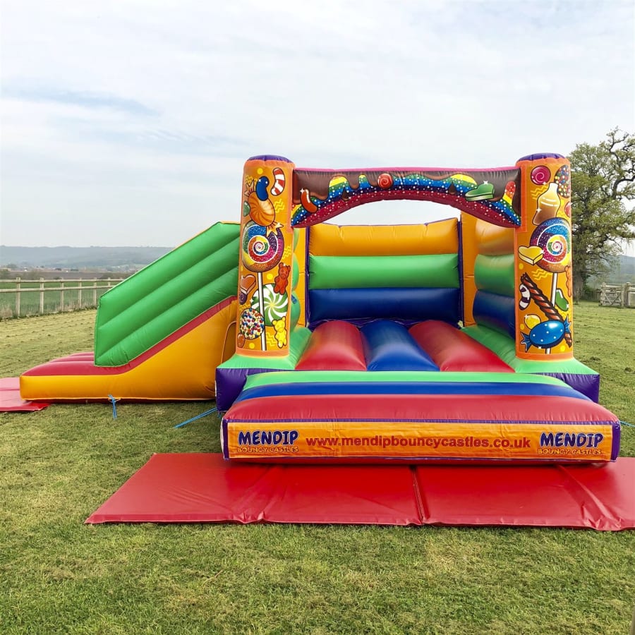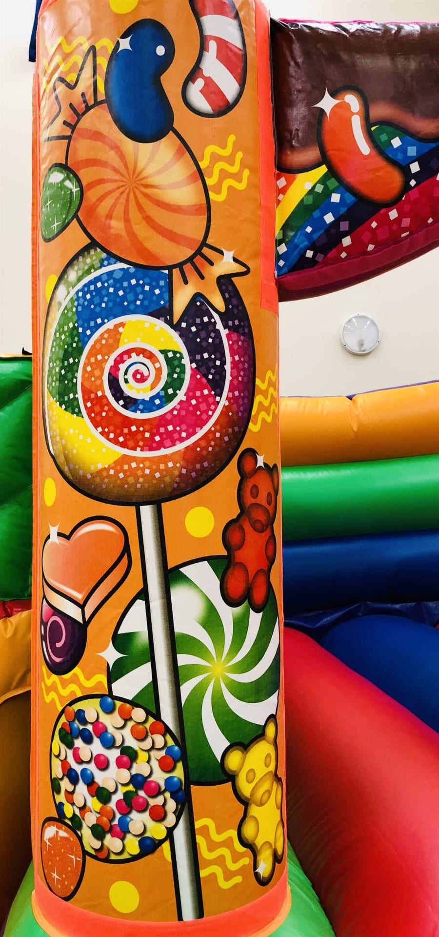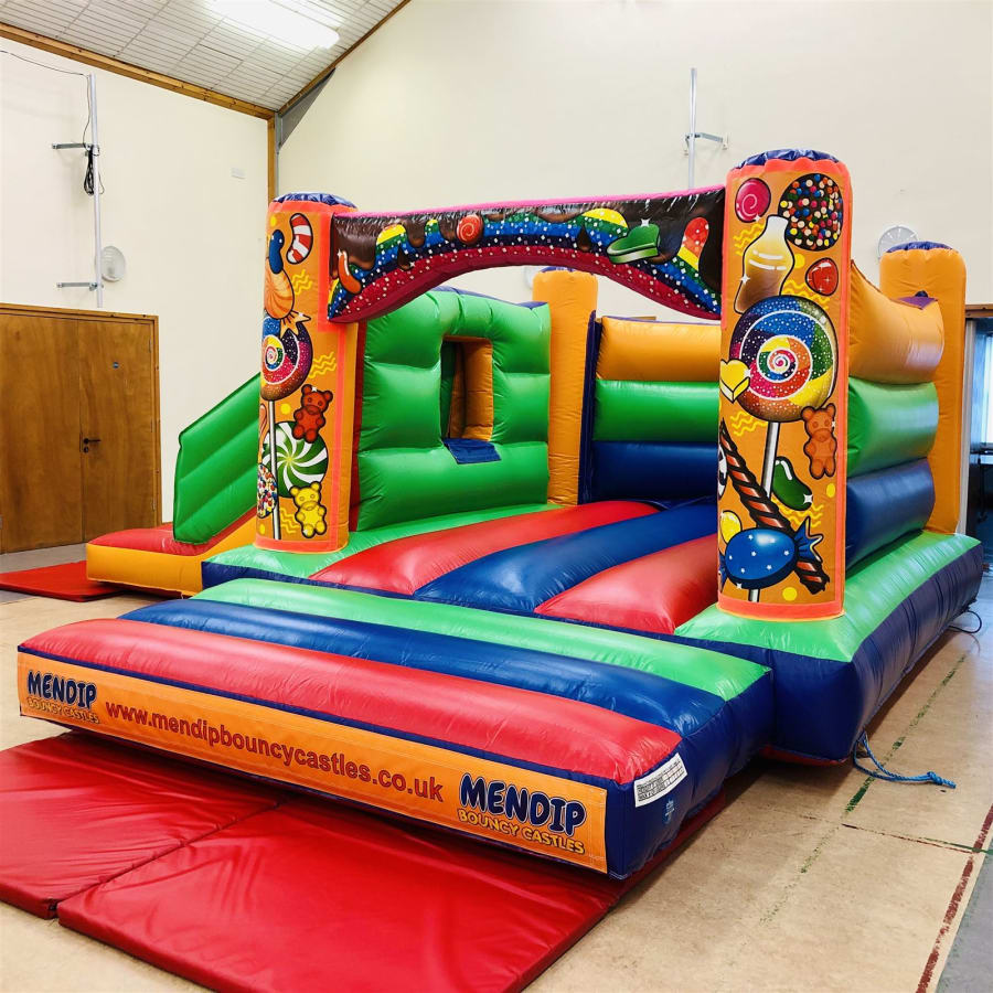Our Low Height 'Candy' Bounce 'N' Slide bouncy castle is a smashing bouncy castle which the kids have lots of fun on and is perfect for most medium to large gardens. This castle is popular for childrens parties and school events across the Mendips, and with it's superb digital printed artwork in a colourful 'Candy' theme and bright colours it is suitable for both boys & girls up to 1.3 metres in height. This castle also fits into most of the local village halls with it's lower height of 7ft 9in.