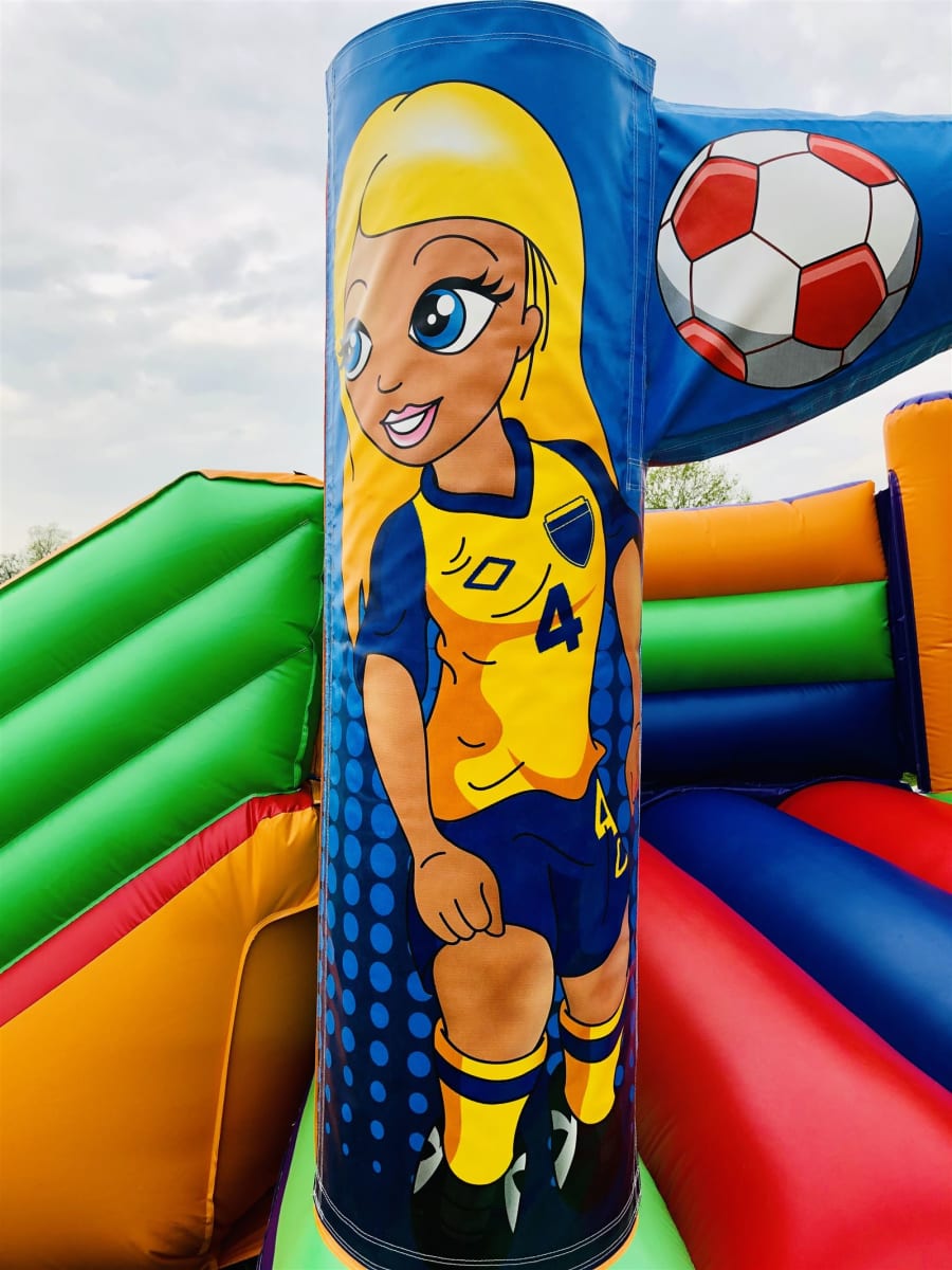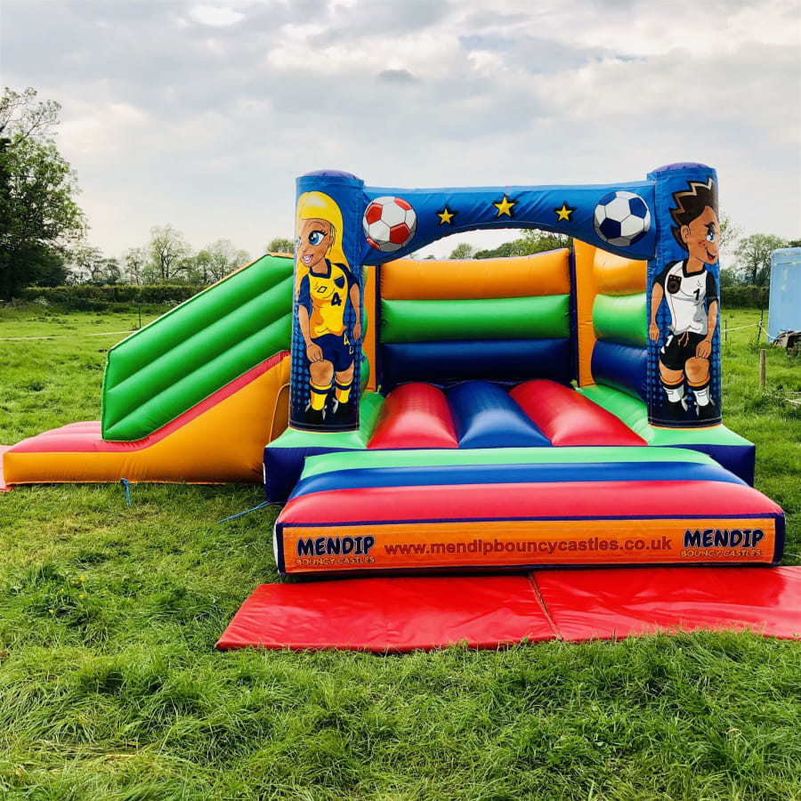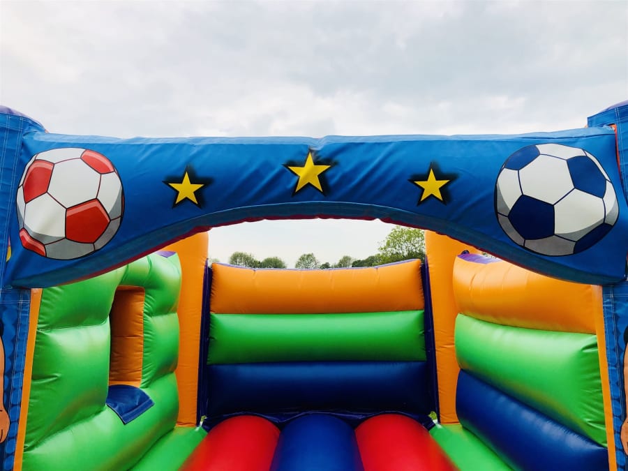 Our Low Height 'Football' Bounce 'N' Slide bouncy castle is a smashing bouncy castle which the kids have lots of fun on and is perfect for most medium to large gardens. This castle is popular for childrens parties and school events across the Mendips, and with it's superb digital printed artwork in a colourful 'Football' theme and bright colours it is suitable for both boys & girls up to 1.3 metres in height. This castle also fits into most of the local village halls with it's lower height of 7ft 9in.