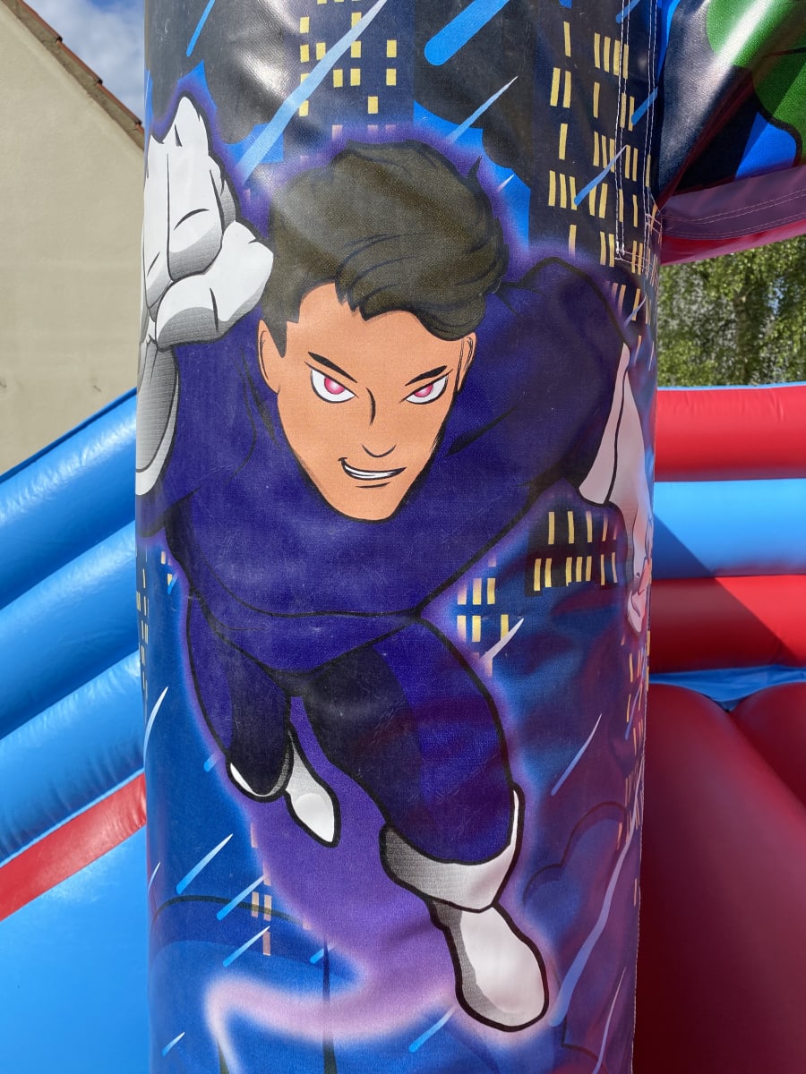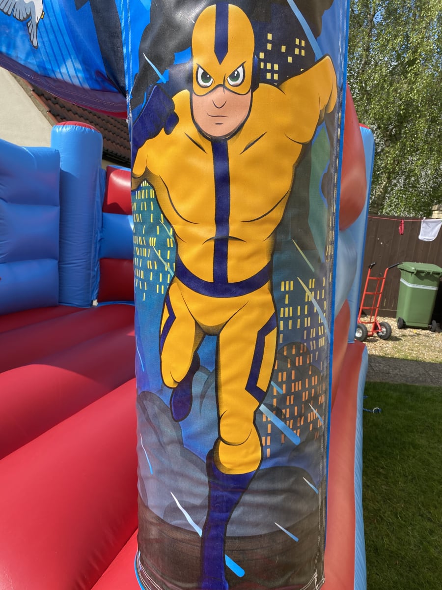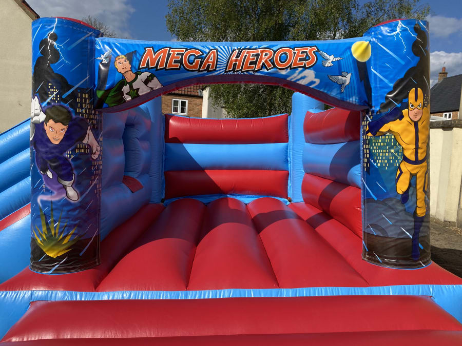 Our Low Height 'Mega Heroes' Bounce 'N' Slide bouncy castle is a smashing bouncy castle which the kids have lots of fun on and is perfect for most medium to large gardens. This castle is popular for childrens parties and school events across the Mendips, and with it's superb digital printed artwork in a colourful 'Mega Heroes' theme and bright colours it is suitable for both boys & girls up to 1.3 metres in height. This castle also fits into most of the local village halls with it's lower height of 7ft 9in.