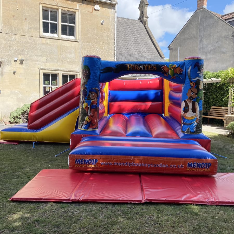 Our Low Height 'Pirates' Bounce 'N' Slide bouncy castle is a smashing bouncy castle which the kids have lots of fun on and is perfect for most medium to large gardens. This castle is popular for childrens parties and school events across the Mendips, and with it's superb digital printed artwork in a colourful 'Pirates' theme and bright colours it is suitable for both boys & girls up to 1.3 metres in height. This castle also fits into most of the local village halls with it's lower height of 7ft 9in.