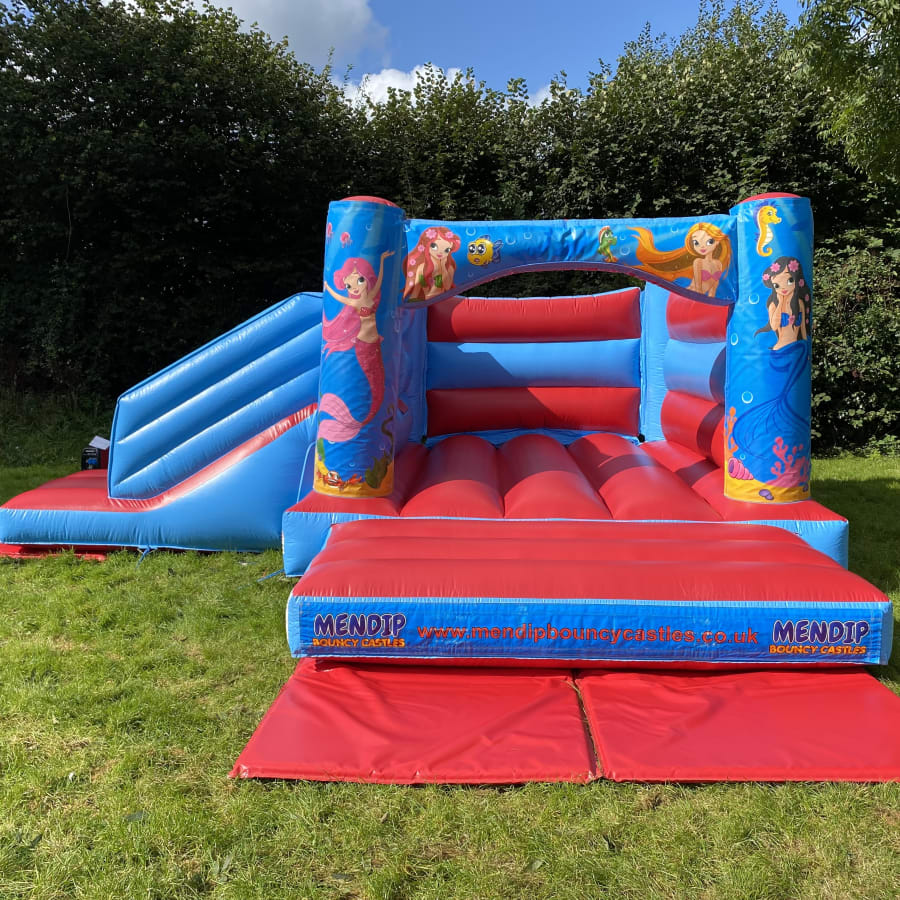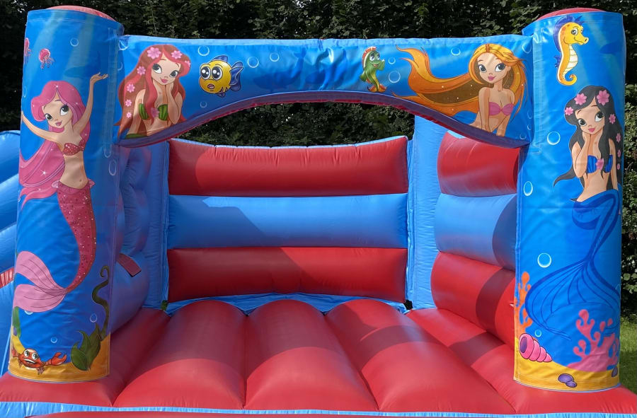 Our Low Height 'Mermaids' Bounce 'N' Slide bouncy castle is a smashing bouncy castle which the kids have lots of fun on and is perfect for most medium to large gardens. This castle is popular for childrens parties and school events across the Mendips, and with its superb digital printed artwork in a colourful 'Mermaids' theme and bright colours it is suitable for both boys & girls up to 1.3 metres in height. This castle also fits into most of the local village halls with it's lower height of 7ft 9in.