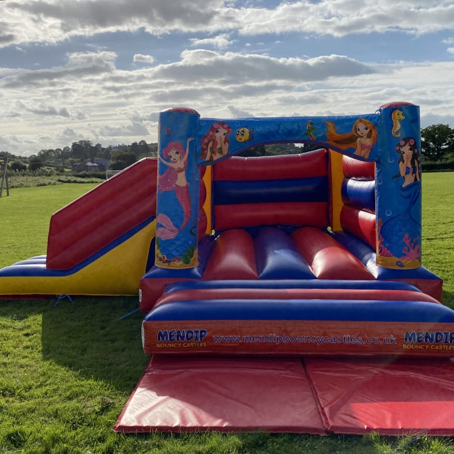 Our Low Height 'Mermaids' Bounce 'N' Slide bouncy castle is a smashing bouncy castle which the kids have lots of fun on and is perfect for most medium to large gardens. This castle is popular for childrens parties and school events across the Mendips, and with its superb digital printed artwork in a colourful 'Mermaids' theme and bright colours it is suitable for both boys & girls up to 1.3 metres in height. This castle also fits into most of the local village halls with it's lower height of 7ft 9in.