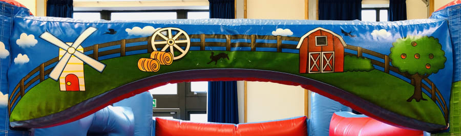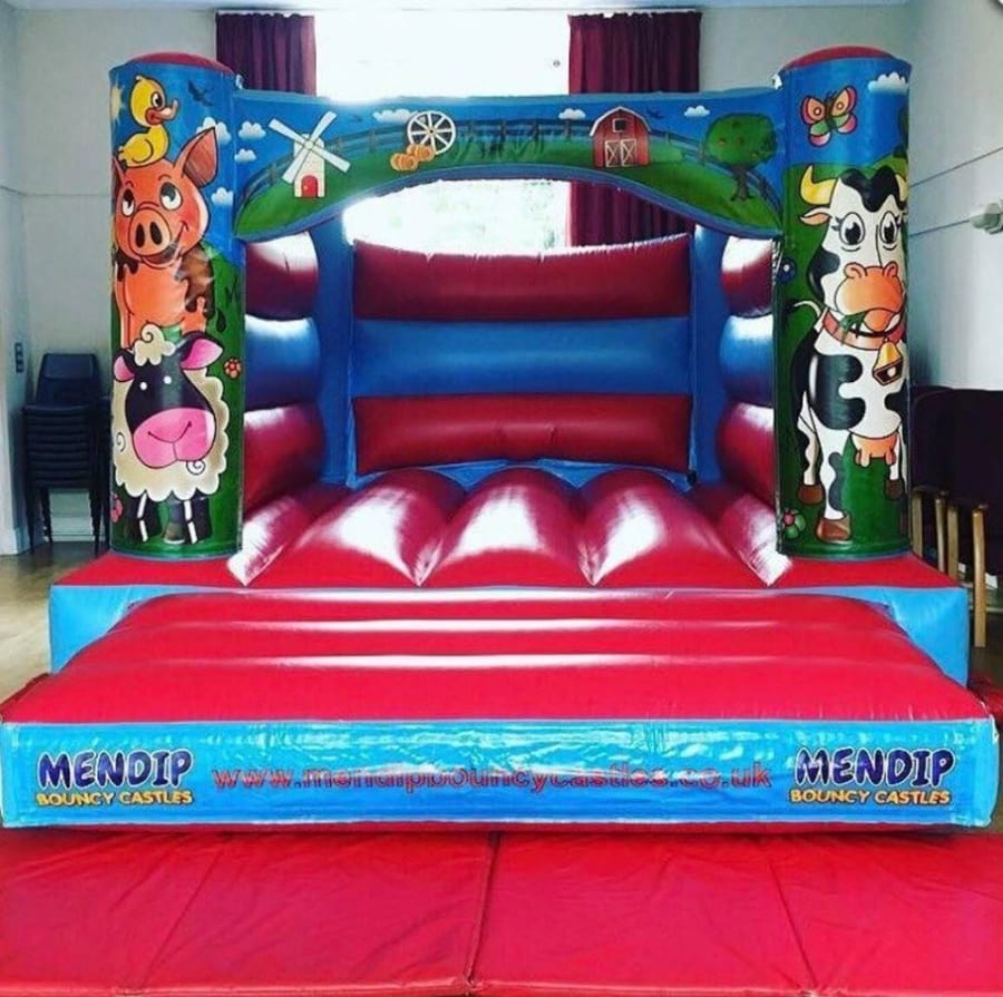 Our Low Height 'Farmyard' H-frame bouncy castle is a smashing bouncy castle which the kids have lots of fun on and is perfect for most sized gardens. This castle is popular for childrens parties and school events across the Mendips, and with it's superb digital printed artwork in a colourful 'Farmyard' theme and bright colours it is suitable for both boys & girls up to 1.3 metres in height. This castle also fits into most of the local village halls with it's lower height of 7ft 9in.