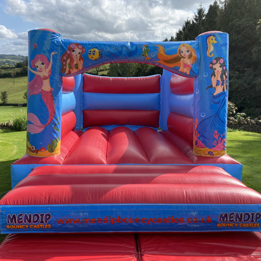 Our Low Height 'Mermaids' H-frame bouncy castle is a smashing bouncy castle which the kids have lots of fun on and is perfect for most sized gardens. This castle is popular for childrens parties and school events across the Mendips, and with its superb digital printed artwork in a colourful 'Mermaids' theme and bright colours it is suitable for both boys & girls up to 1.3 metres in height. This castle also fits into most of the local village halls with it's lower height of 7ft 9in.